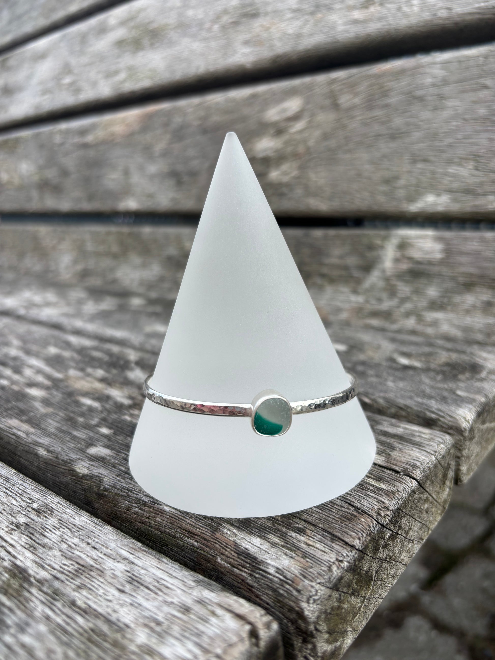 Solid 3.5mm Wide Plain Hallmarked Bangle with a lovely piece of Green and White Multi Seaglass set in a Sterling Silver Bezel to create this stunning statement piece