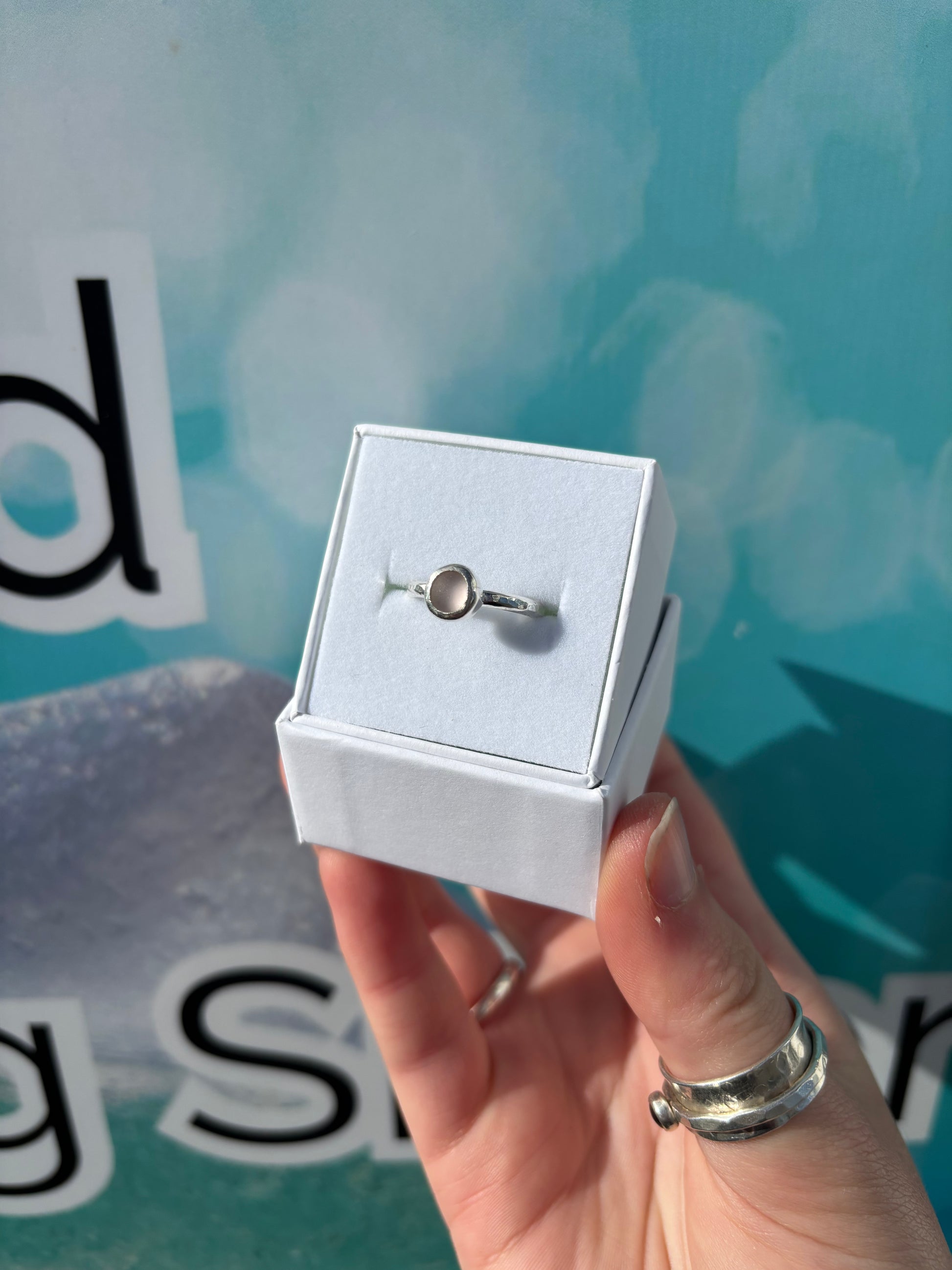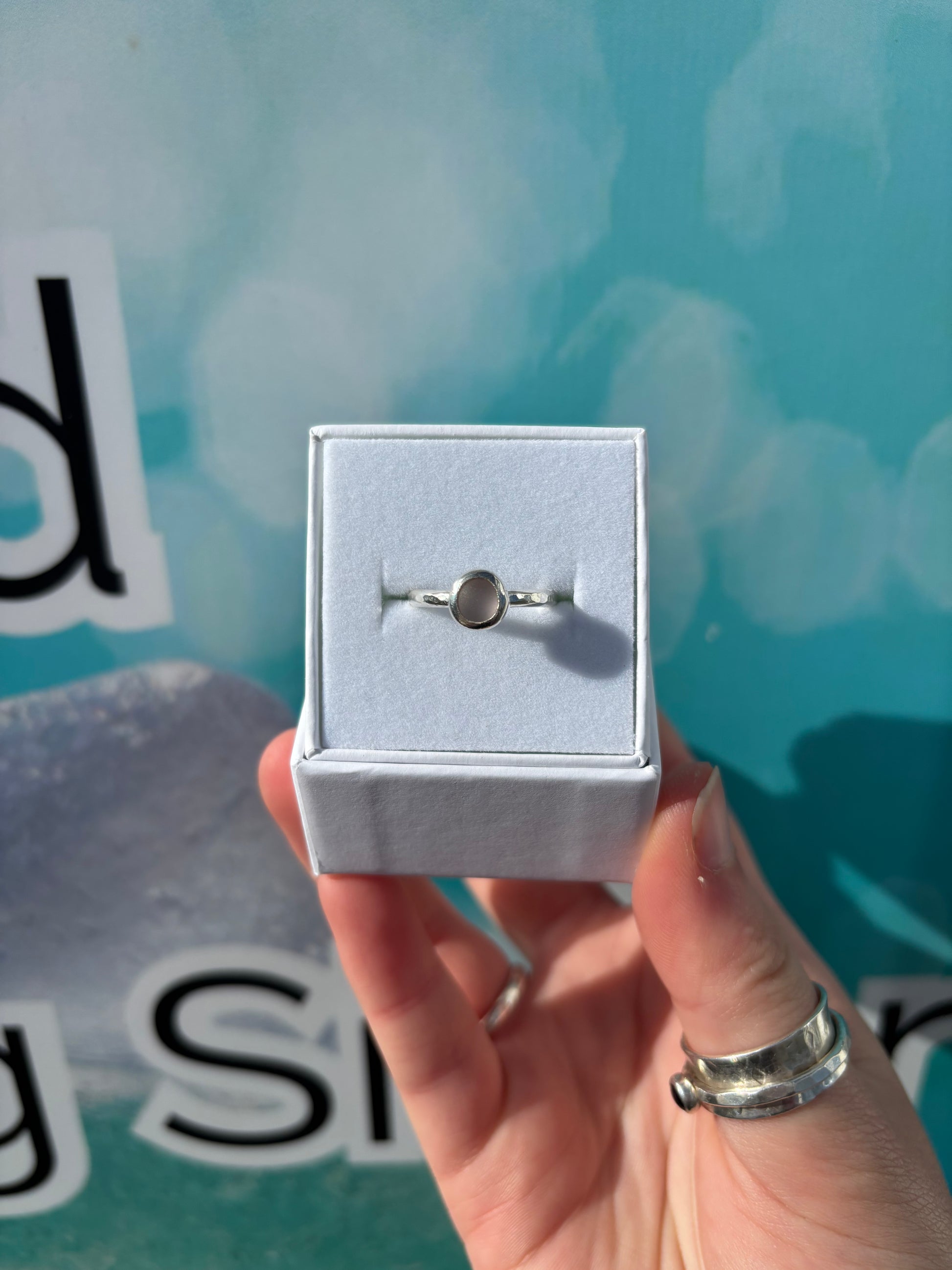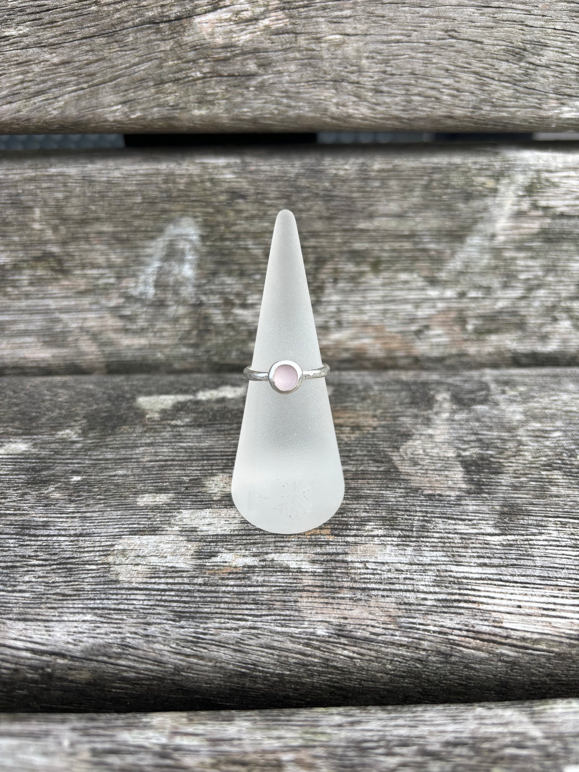 Perfect for all ocean lovers, these unique pieces of SeaGlass are beautifully bezel set in 925 Sterling Silver rings. This Pink SeaGlass ring is a Size M and has a hammered D shape band.