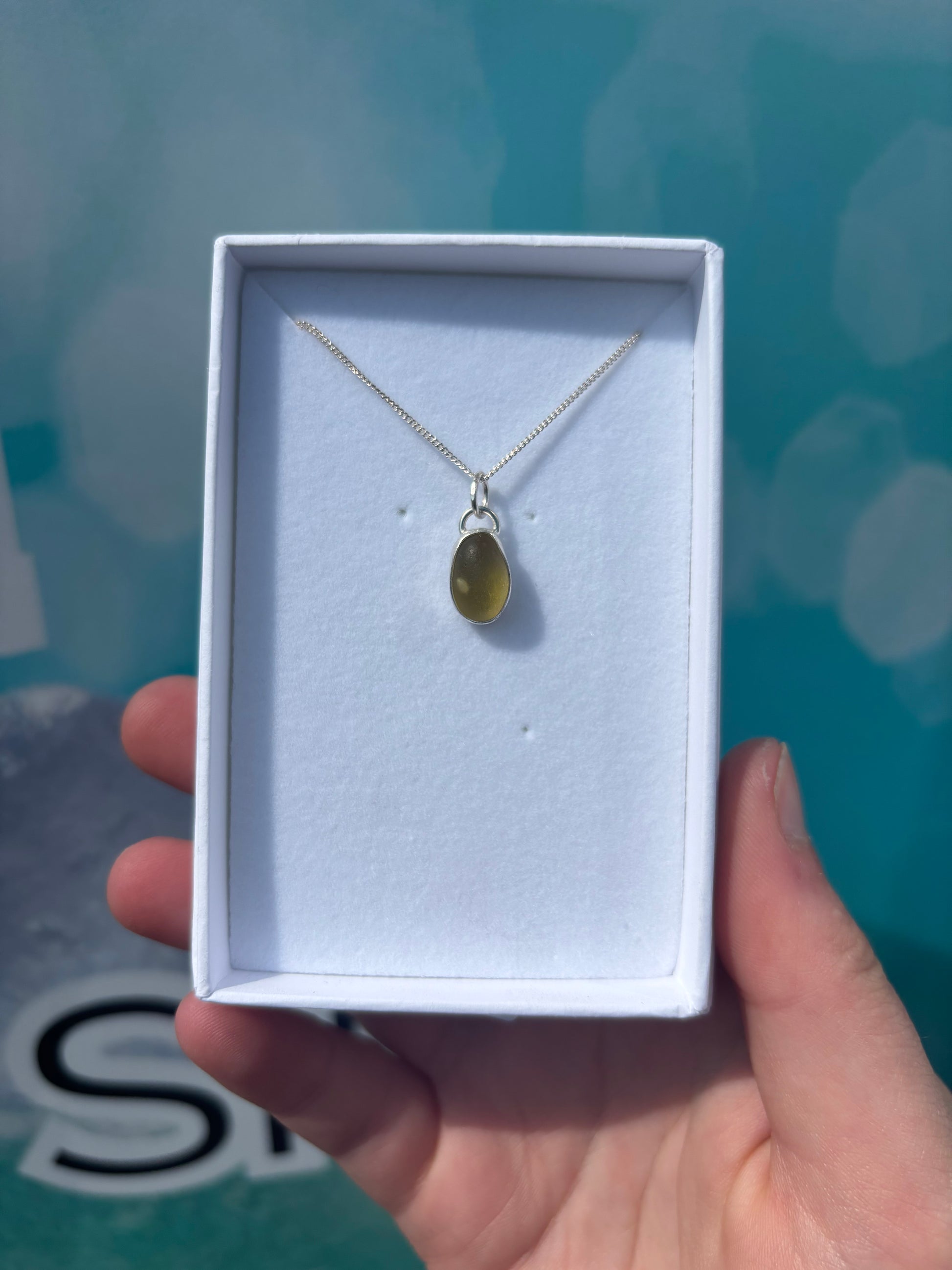 Made with a Sterling Silver bezel, this Necklace has a lovely piece of Yellow SeaGlass set on a Diamond Curb Sterling Silver Chain.